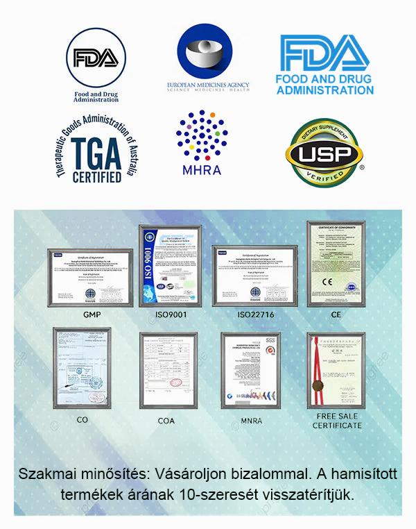 Az Amerikai Élelmiszer- és Gyógyszerügyi Hatóság (FDA) az Egyesült Államok elsődleges szabályozó hatósága, amely az orvosi termékek biztonságáért, hatékonyságáért és minőségéért felel. Az FDA tanúsítvány azt jelenti, hogy a termék átfogó tesztelésen esett át, és megfelel a legmagasabb biztonsági és hatékonysági előírásoknak.