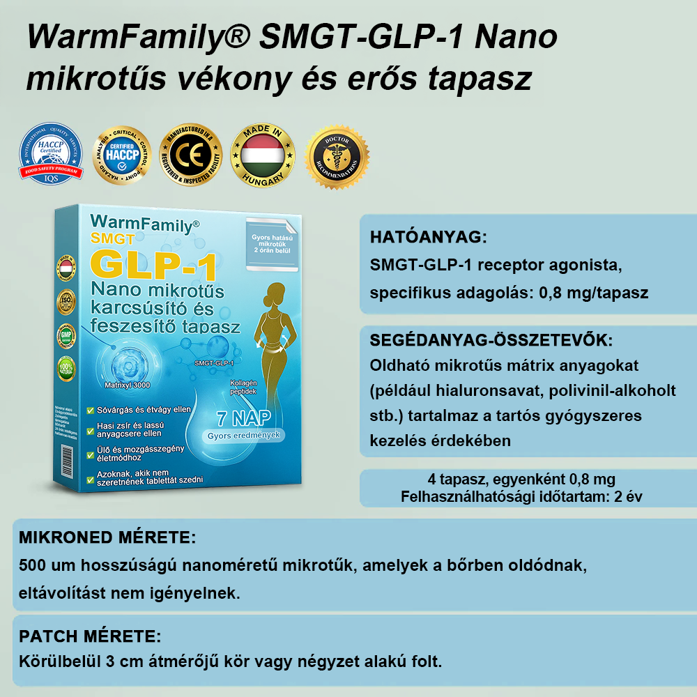 WarmFamily® SMGT-GLP-1 Nano Mikrotű Tapasz Kollagénnel és Matrixyl 3000-rel ✅ | Klinikailag bizonyított hatás fogyásra, szív- és érrendszeri egészségre, cukorbetegségre és egyéb egészségügyi problémákra, orvosok által ajánlott 👨⚕️