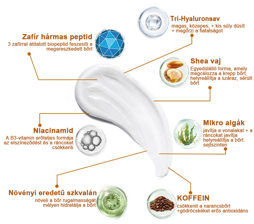 𝐌𝐨𝐨𝐧𝐝𝐚𝐫 ™ 𝐟𝐞 𝐬𝐳𝐞𝐬í𝐭ő 𝐟𝐢𝐚𝐭 𝐚𝐥í𝐭ó 𝐤𝐫é𝐦 hatékonyan csökkenti az öregedés látható jeleit és a ráncokat, 3-5 hét alatt megfiatalítja a bőrt. Ez a krém olyan tudományosan bizonyított összetevőket tartalmaz, mint a Sapphire Tripeptide, a Triple Hyaluronic Acid és a Microalgae a ráncok elleni küzdelem és a bőr vitalitásának elősegítése érdekében